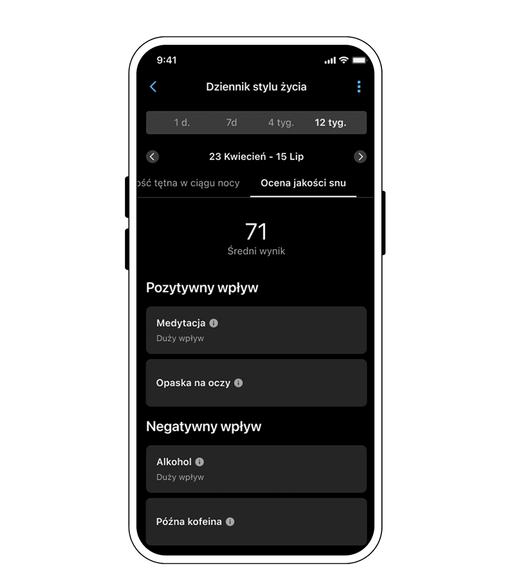 Po zebraniu danych aplikacja tworzy raporty pokazujące, jak poszczególne nawyki wpływają na wybrane wskaźniki: poziom stresu, ocenę jakości snu oraz nocną zmienność tętna. Wpływ może być oznaczony jako pozytywny, negatywny lub minimalny.