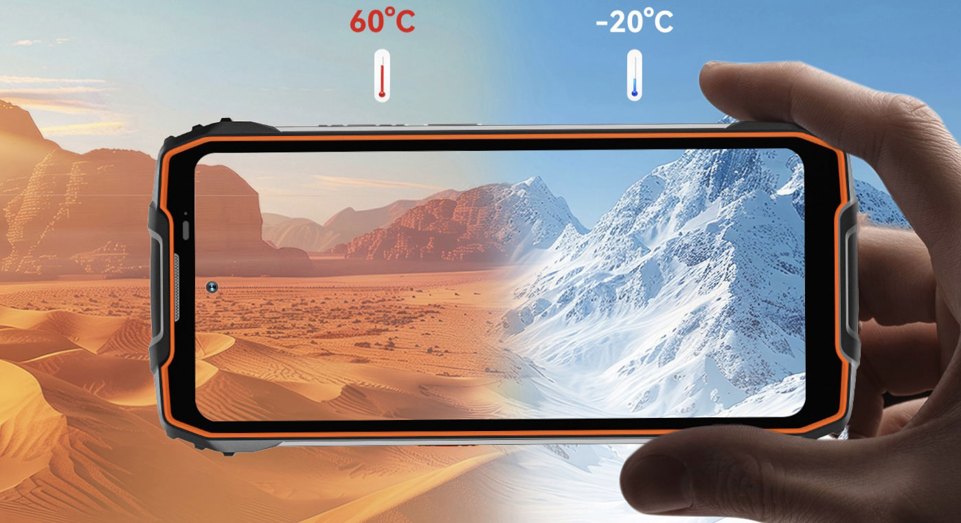 Urządzenie spełnia normy IP68 i IP69K oraz wojskowy standard MIL-STD-810H, co w praktyce oznacza odporność na wodę, kurz, wstrząsy i skrajne temperatury od –20°C do +60°C.
