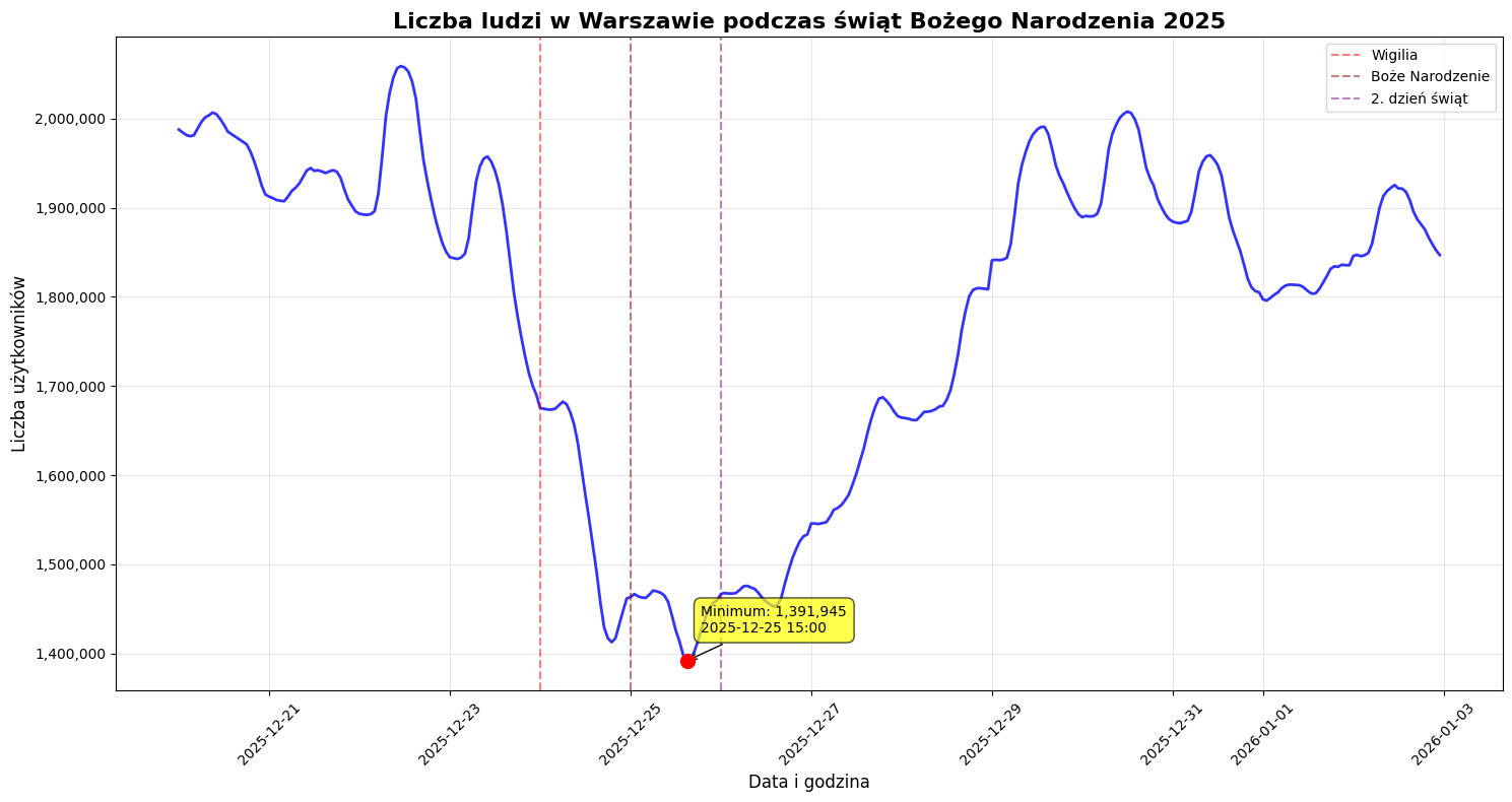 Z analizy danych można też dowiedzieć się, że w 1. dzień świąt było w Warszawie mniej osób (1 391 945 o godz. 15:00) niż w Wigilię (1 417 088 o godz. 18:00).