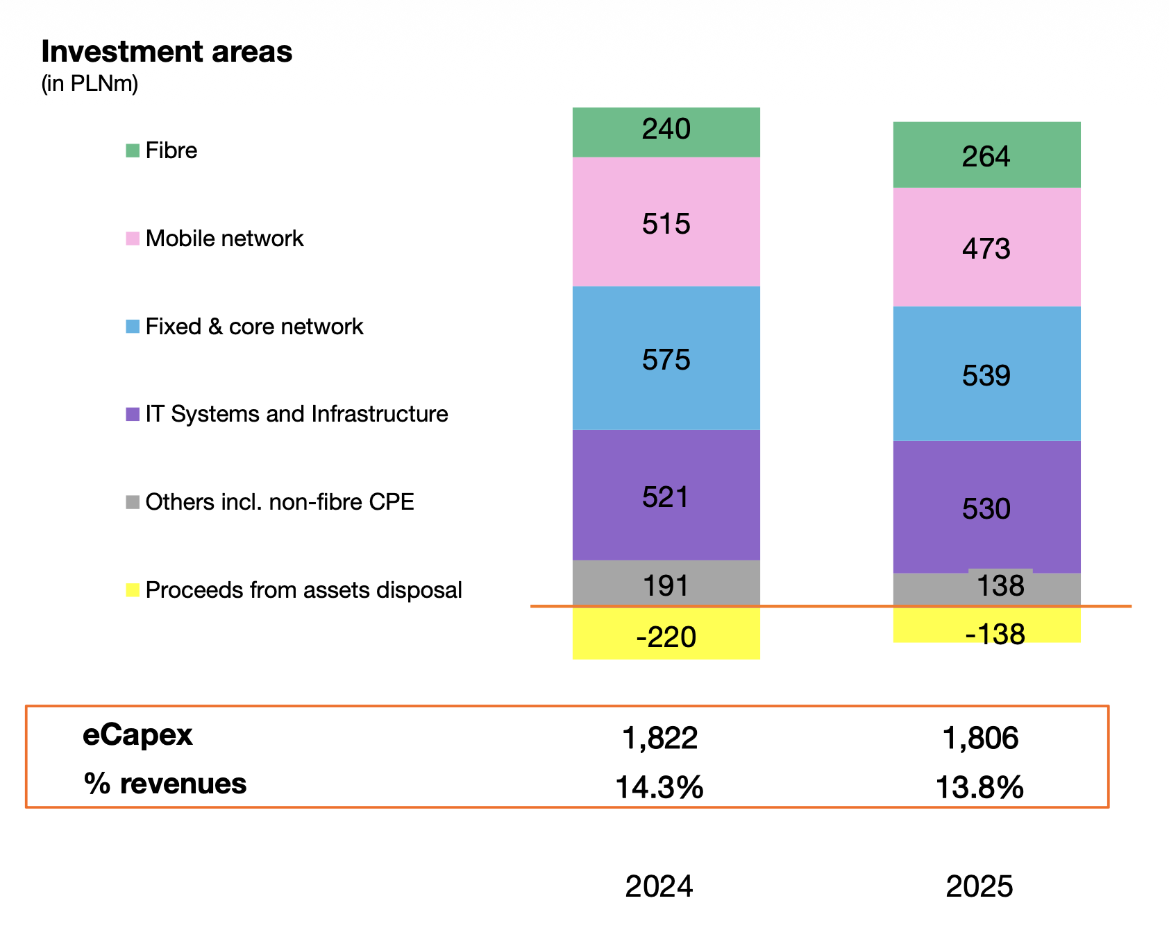 W samym czwartym kwartale przychody zwiększyły się w ujęciu rocznym o 155 mln zł, czyli o 4,6%. Główne czynniki wzrostu były podobne jak w przypadku wyników całorocznych. Przychody z kluczowych usług telekomunikacyjnych zwiększyły się o 5,5% rok-do-roku (co oznacza nieco niższą dynamikę wzrostu niż w kilku poprzednich kwartałach, odzwierciedlającą wyższą bazę porównawczą, wynikającą z wprowadzonych w listopadzie 2024 roku podwyżek cen usług przedpłaconych).