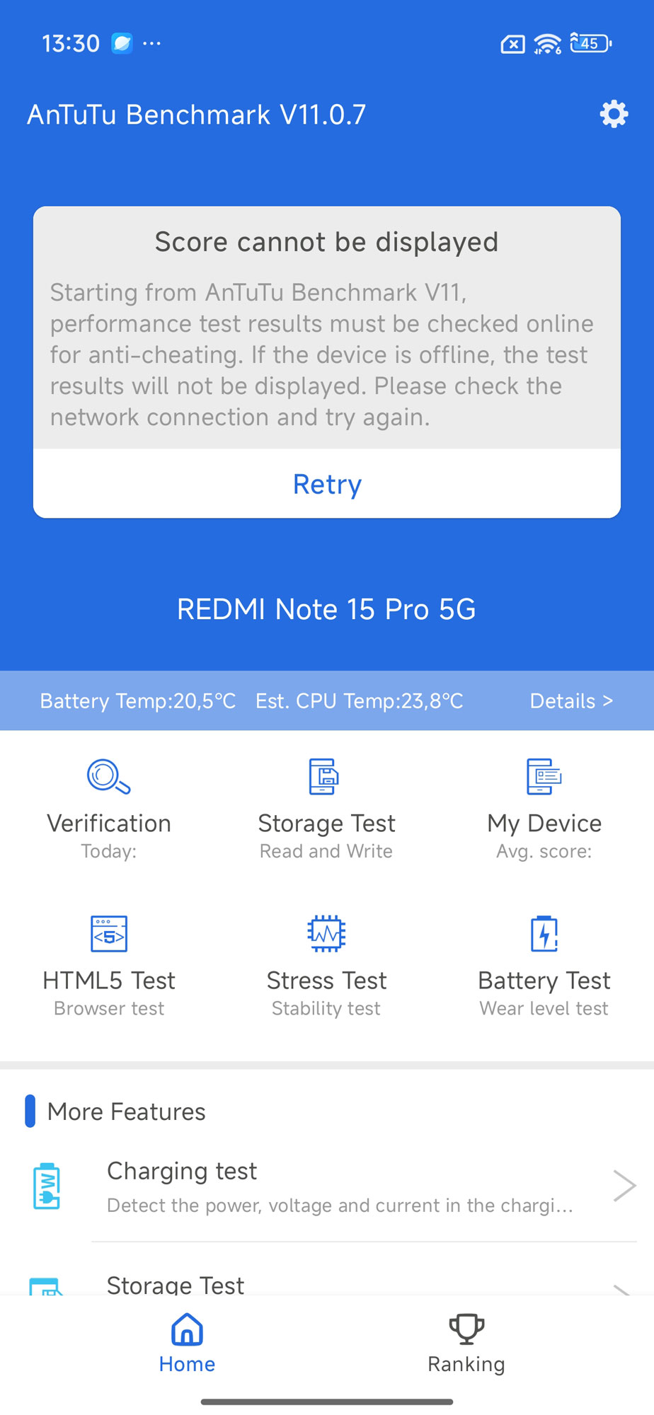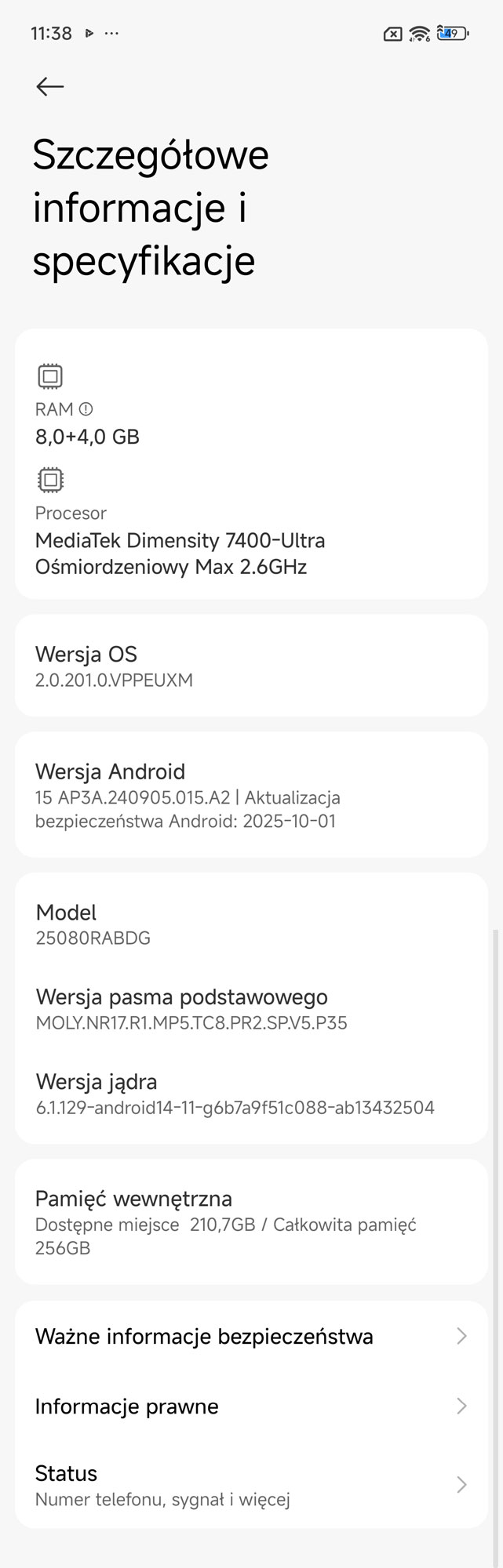 Telefon jest wyposażony w procesor MediaTek Dimensity 7400-Ultra (4 nm) z układem graficznym Mali-G615. Do wyboru mamy warianty z 8 GB lub 12 GB pamięci RAM LPDDR4X oraz 256 GB lub 512 GB pamięci na pliki starszego typu UFS 2.2. Choć wydajność jest w zupełności wystarczająca do płynnej pracy, wyniki Antutu pozostają niewiadomą ze względu na systemową blokadę aplikacji benchmarkowych.