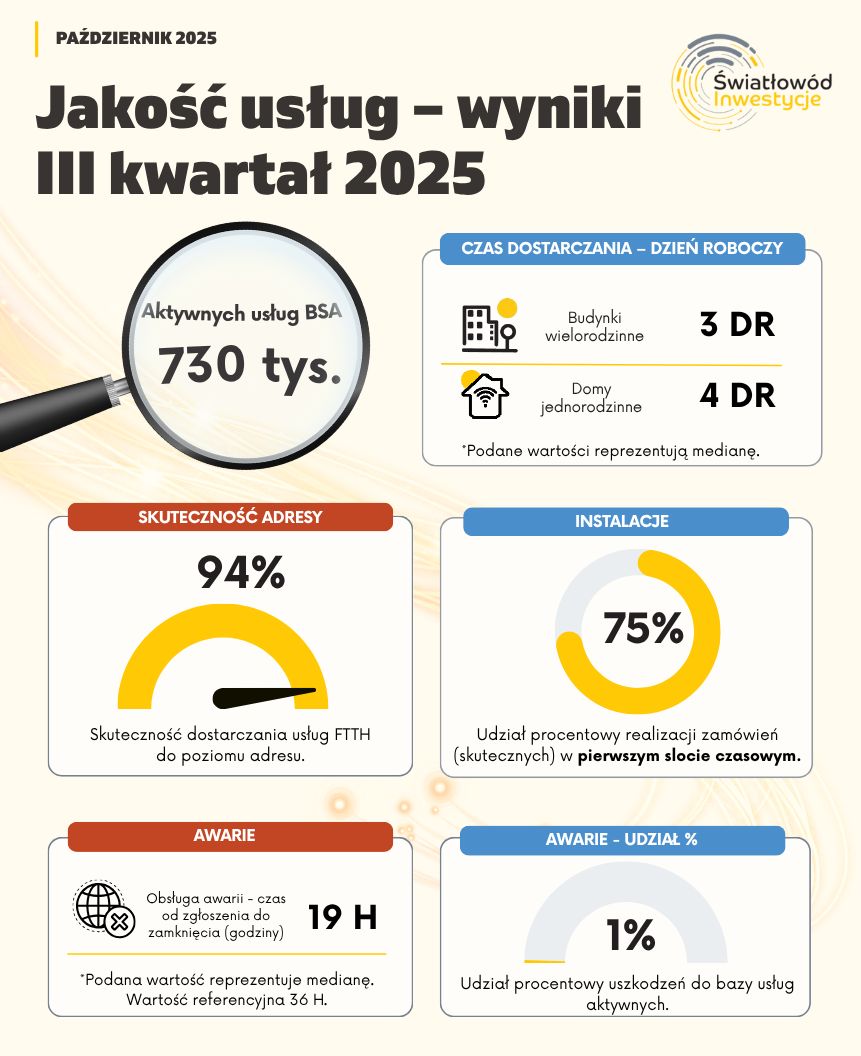 Światłowód Inwestycje opublikował wyniki jakościowe za trzeci kwartał 2025 roku dla usług FTTH. Spółka podaje, że skuteczność dostarczania usług do poziomu adresu wyniosła 94 procent. Wskaźnik instalacji zrealizowanych w pierwszym dostępnym slocie czasowym osiągnął 75 procent. Mediana czasu usunięcia awarii od zgłoszenia do zamknięcia to 19 godzin, podczas gdy wartość referencyjna SLA wynosi 36 godzin. Udział awarii w bazie aktywnych usług utrzymał się w okolicach 1 procenta.