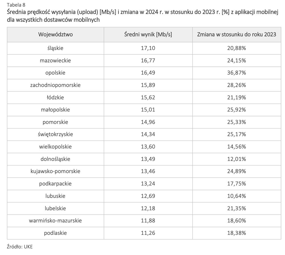 Średnia prędkość wysyłania danych wzrosła z 21,4 Mb/s w 2020 r. do 49,1 Mb/s w 2024 r., co stanowi wzrost o ponad 100%.