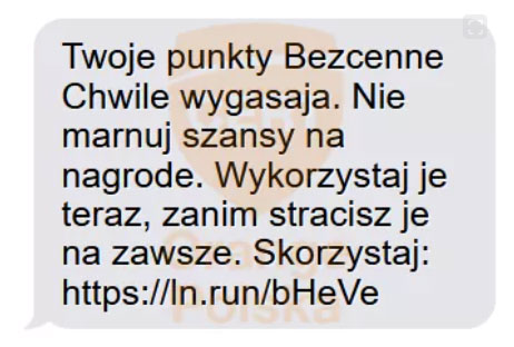 Ataki realizowane są przez SMS-y, w których nadawca podpisany jest jako „Mastercard” lub bardzo podobnie. W treści wiadomości pojawia się informacja o rzekomej nagrodzie lub dużej liczbie punktów do wykorzystania oraz link prowadzący do fałszywej strony. Często jest to link skrócony, co dodatkowo utrudnia ocenę, dokąd faktycznie prowadzi.