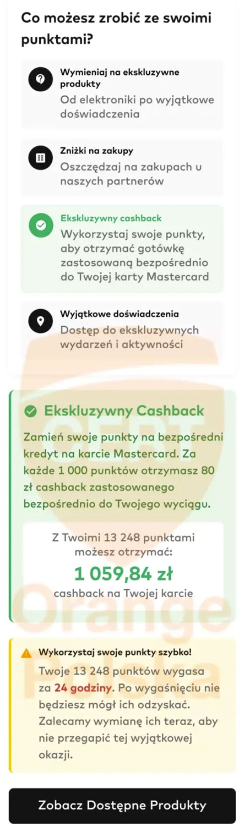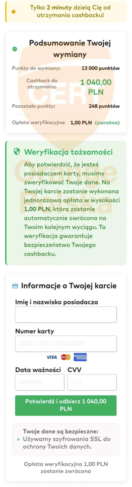 W kolejnym kroku fałszywy serwis informuje o możliwości wypłaty atrakcyjnego cashbacku – nawet ponad tysiąca złotych – powiązanego z tymi punktami. Pojawia się odwołanie do loterii Bezcenne Chwile i dodatkowa informacja, że z promocji mogą korzystać tylko posiadacze kart kredytowych. To nie jest przypadek: limit na karcie kredytowej jest zazwyczaj wyższy niż środki dostępne na koncie z kartą debetową, co dla przestępców oznacza większy potencjalny „zysk”.