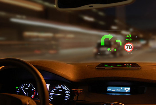 NaviExpert dla Androida z trybem udającym HUD: wskazówki nawigacyjne widoczne na szybie samochodu