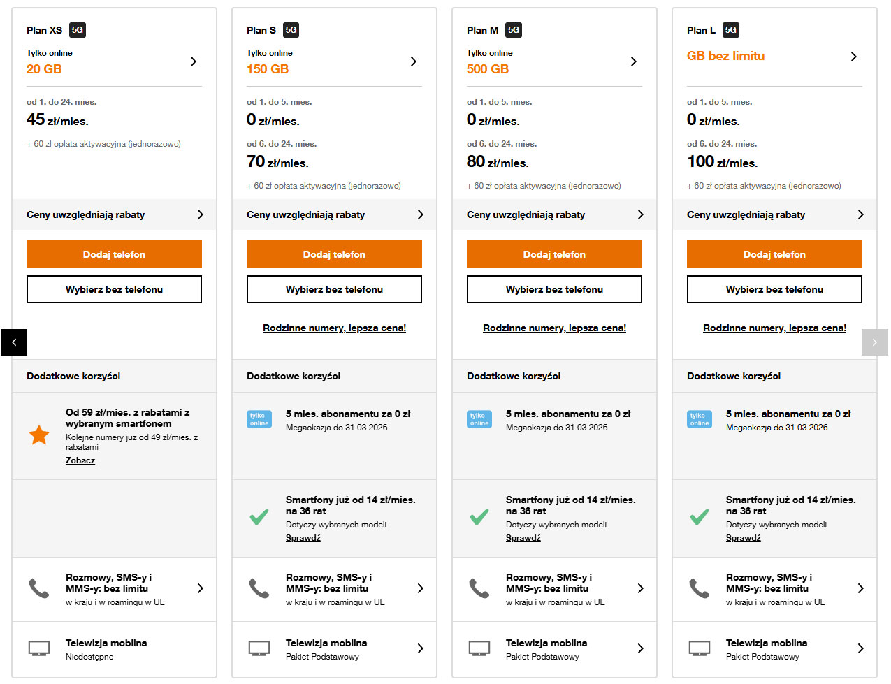 Orange delikatnie odświeżył swoją ofertę abonamentową. Operator nadal stawia na cztery główne warianty – XS, S, M i L – które są dostępne z opłatą początkową na poziomie 0 zł.