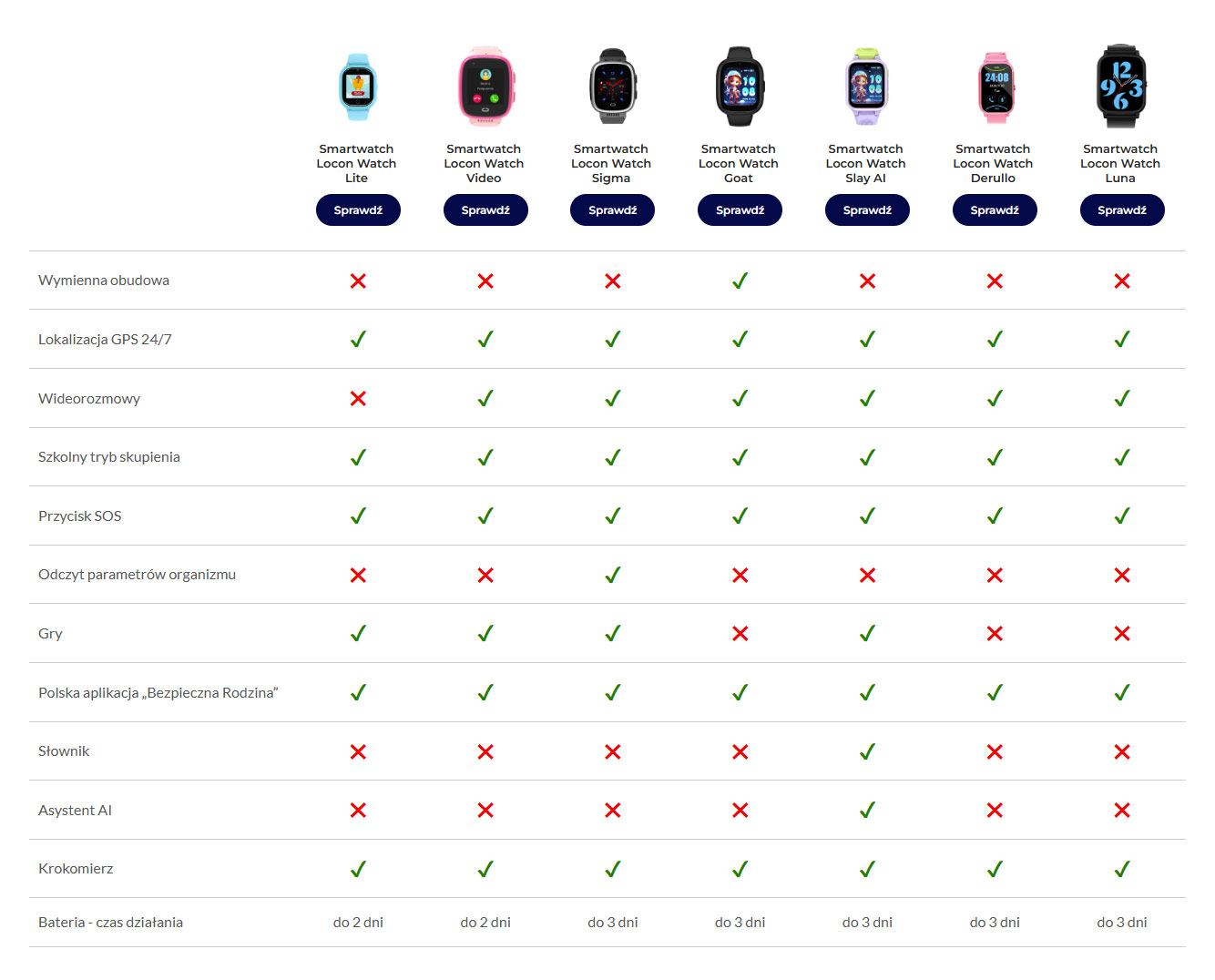 Locon Watch Goat to propozycja w bardziej „dziecięcym” wydaniu, z wymienną obudową i paskiem, co pozwala dopasować wygląd zegarka do preferencji użytkownika. Urządzenie wyposażono w ekran TFT o przekątnej 1,7 cala i rozdzielczości 240 × 280 pikseli. Na pokładzie znalazło się 64 MB RAM i 128 MB pamięci wewnętrznej, a bateria o pojemności 770 mAh ma zapewnić do 3 dni pracy w trybie czuwania. Zegarek oferuje przycisk SOS, tryb szkolny ograniczający rozpraszanie, budzik oraz krokomierz. Producent deklaruje również podwyższoną odporność na wodę na poziomie IP68. Całość waży 52 gramy, a wymiary urządzenia to 51,2 × 42,8 × 15,5 mm.