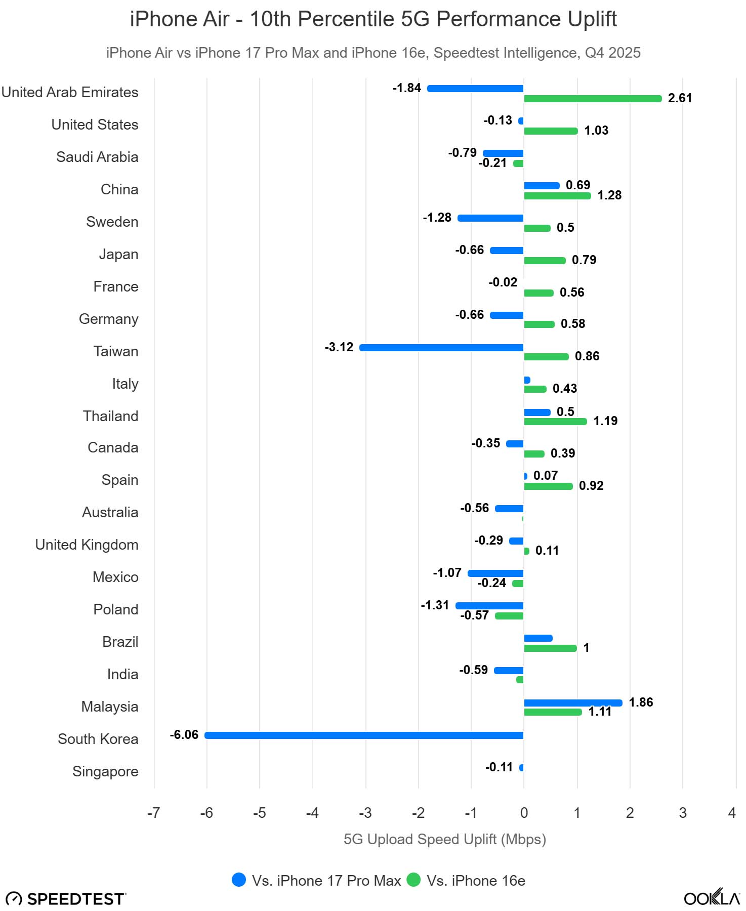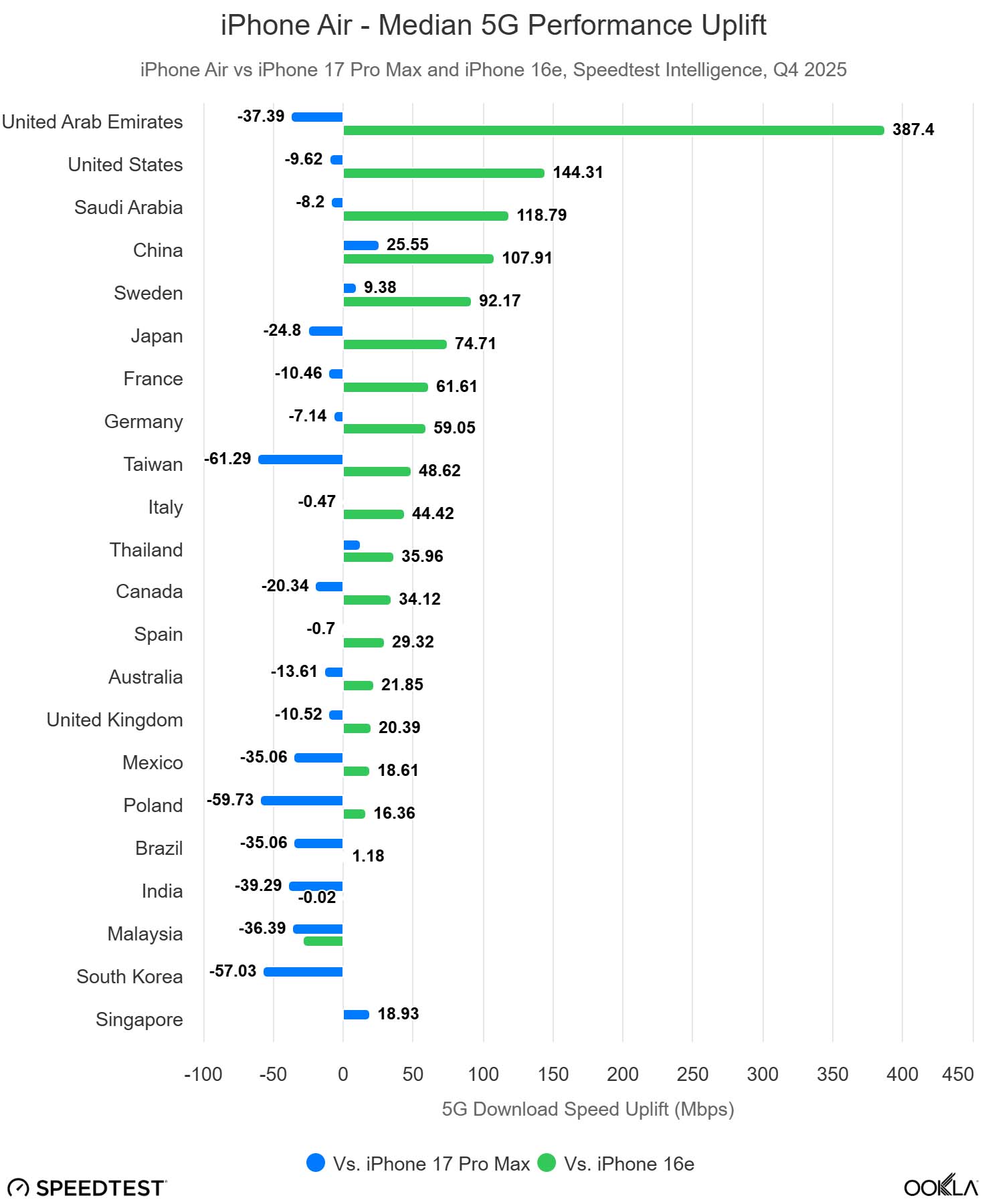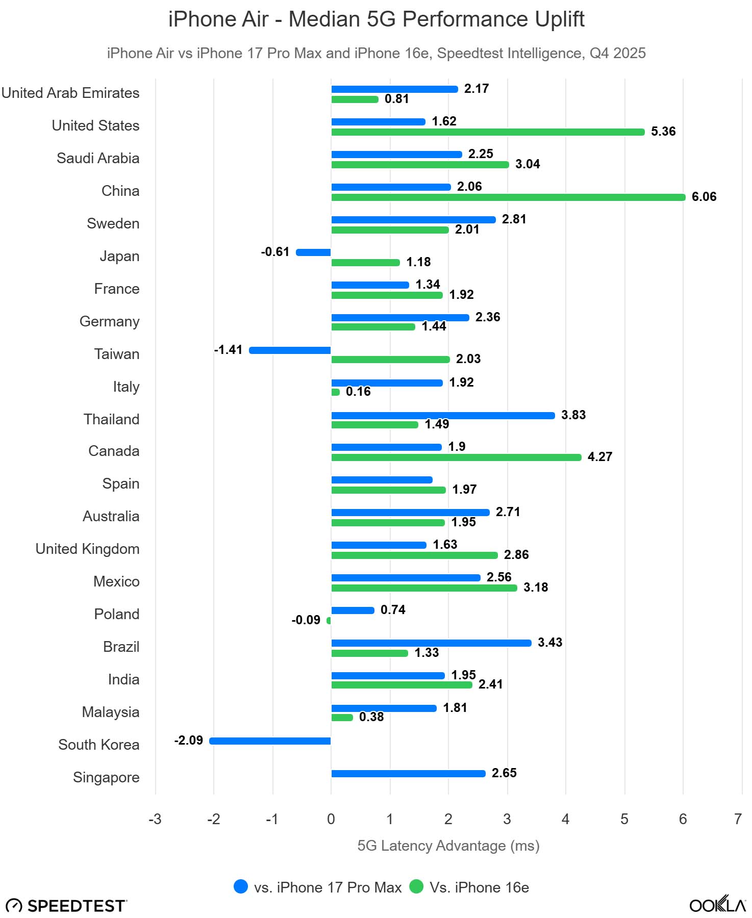 iPhone Air w znacznym stopniu przyćmił Samsunga Galaxy S25 Edge na całym świecie, wyprzedzając go w Stanach Zjednoczonych w stosunku 3 do 1 na podstawie danych Speedtest, podczas gdy Edge pozostaje statystycznie nieistotny pod względem popularności na rynkach europejskich. Korea Południowa pozostaje głównym wyjątkiem pod względem konkurencji, napędzanym silnym nastawieniem na rynek krajowy.