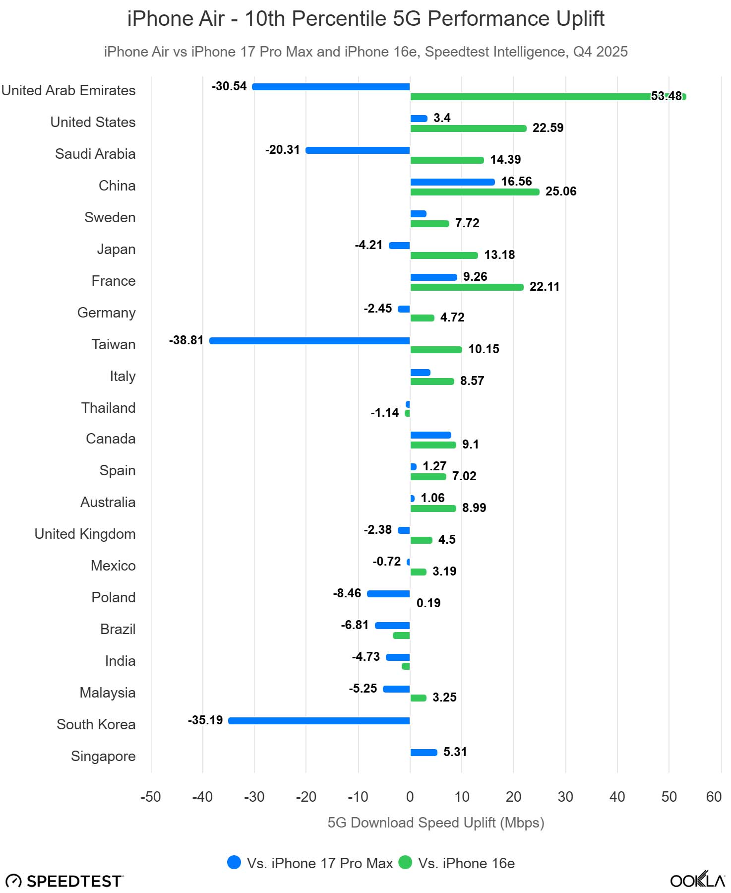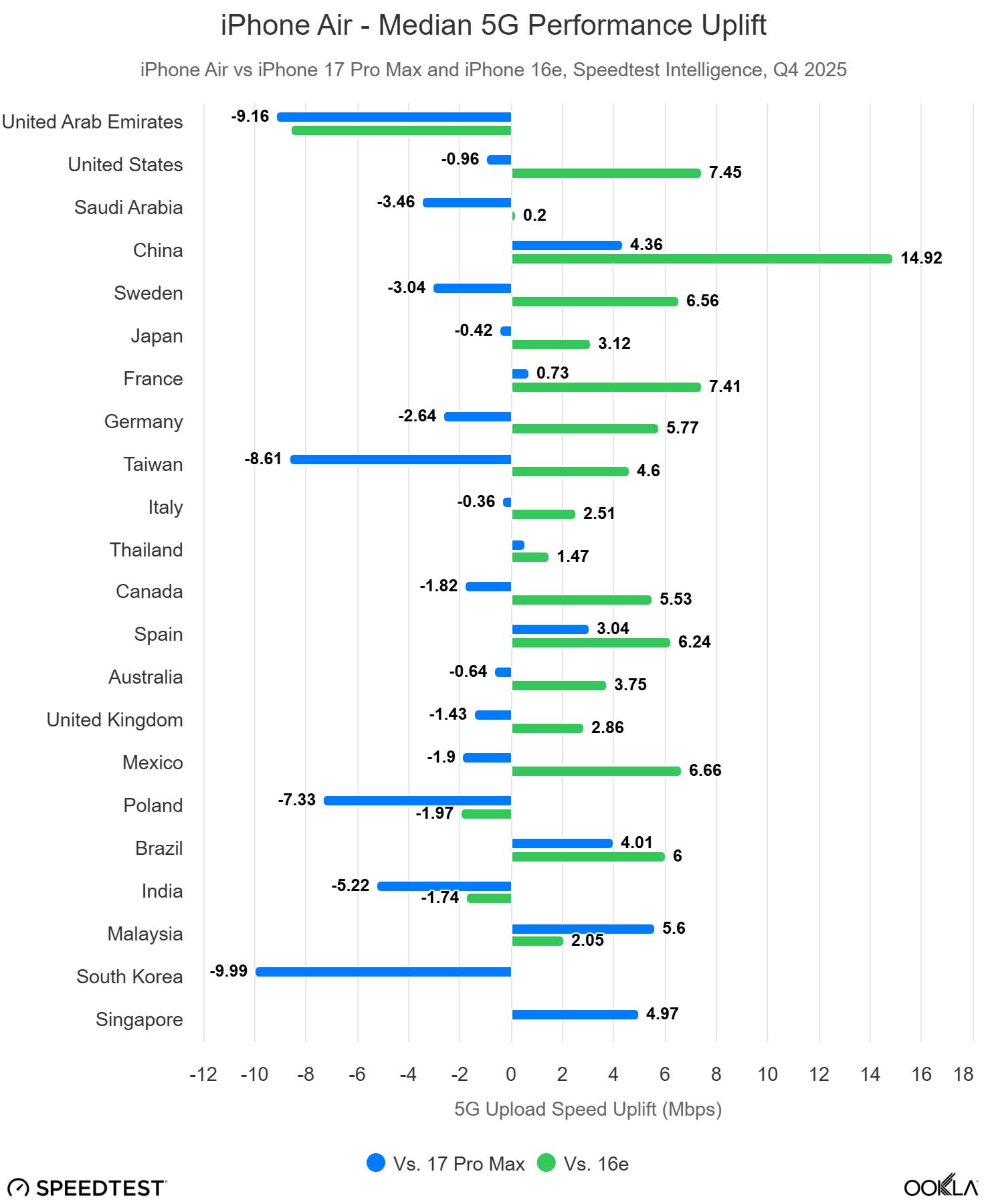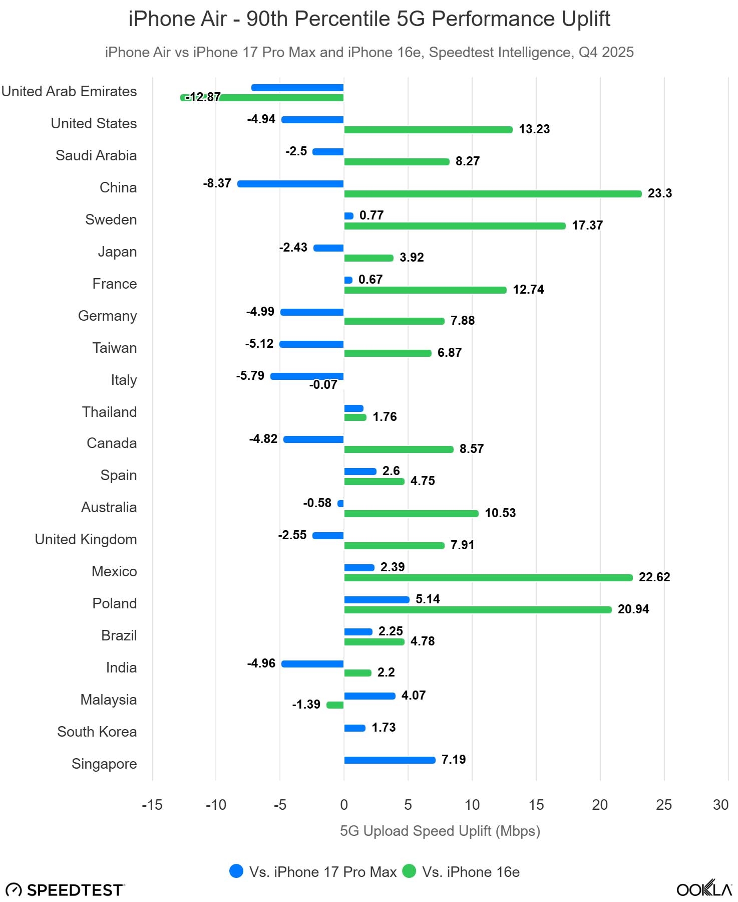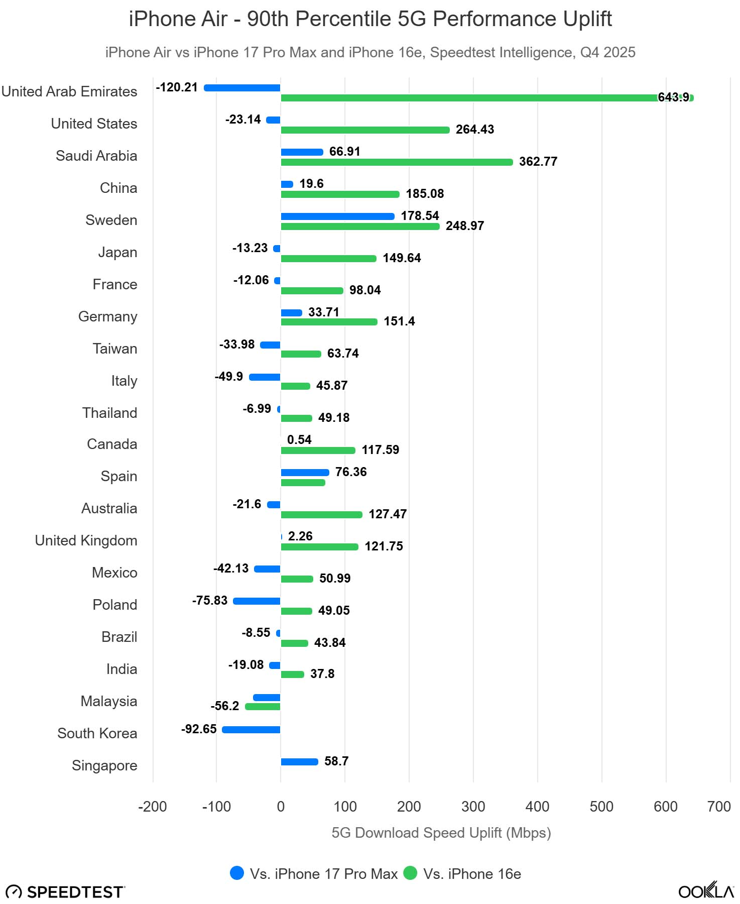 iPhone Air w znacznym stopniu przyćmił Samsunga Galaxy S25 Edge na całym świecie, wyprzedzając go w Stanach Zjednoczonych w stosunku 3 do 1 na podstawie danych Speedtest, podczas gdy Edge pozostaje statystycznie nieistotny pod względem popularności na rynkach europejskich. Korea Południowa pozostaje głównym wyjątkiem pod względem konkurencji, napędzanym silnym nastawieniem na rynek krajowy.