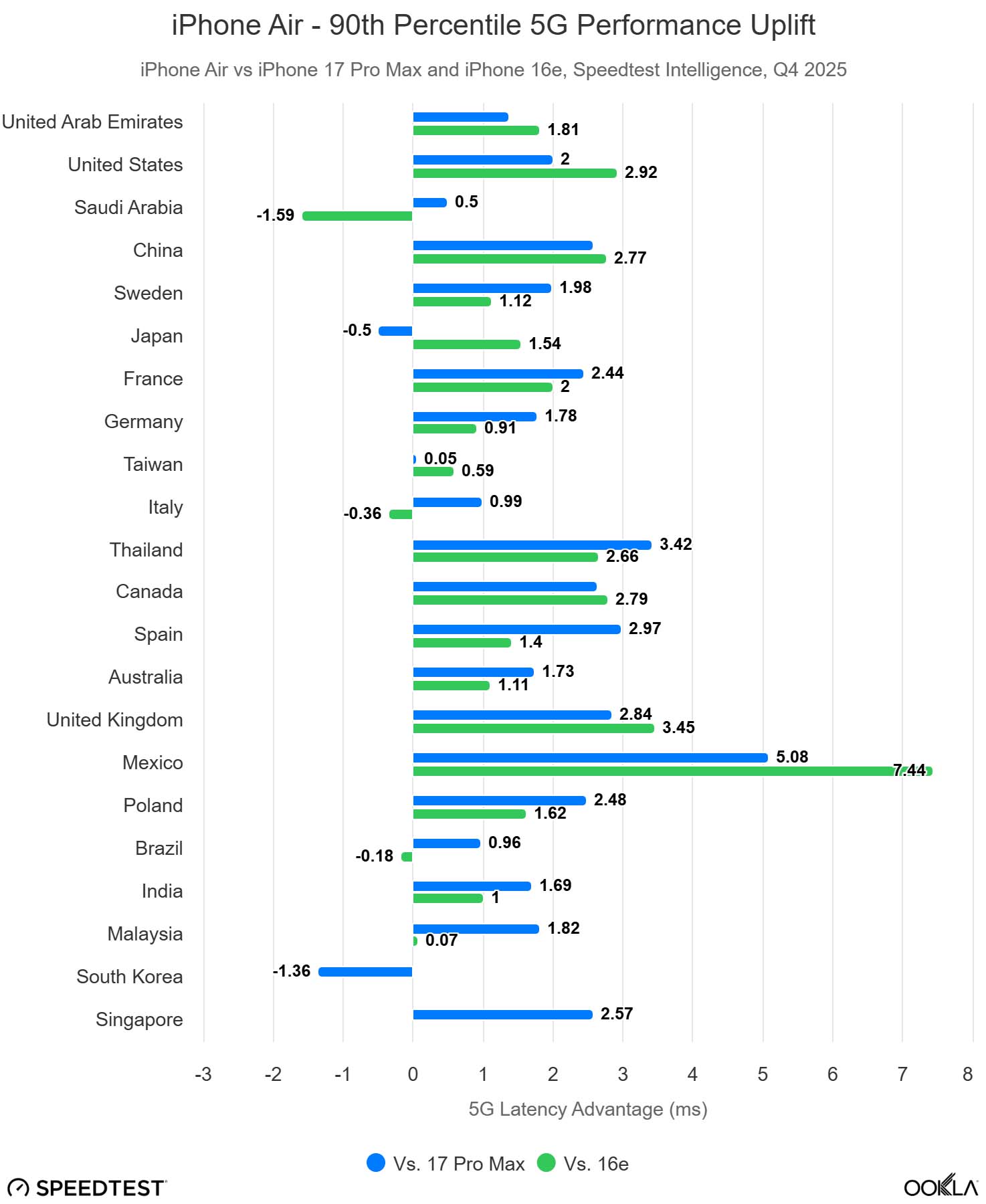 Bardziej ścisła integracja sprawia, że opóźnienia stają się nowym czynnikiem wyróżniającym. iPhone Air osiągnął lepsze wyniki niż iPhone 17 Pro Max z procesorem Qualcomm pod względem opóźnień na 19 z 22 analizowanych rynków. Sugeruje to, że ściślejsza integracja modemu z procesorem w urządzeniach Apple może zapewnić płynniejsze wrażenia użytkownika i może być kluczowym czynnikiem wyróżniającym urządzenia wyposażone w procesory Apple Silicon.