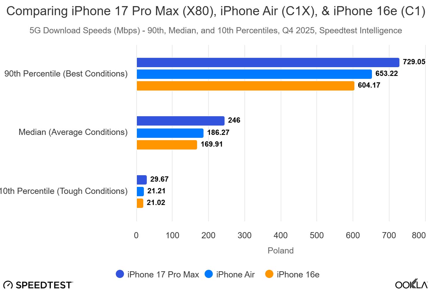 W oparciu o globalne dane Ookla Speedtest raport analizuje rzeczywistą wydajność niestandardowego modemu C1X w telefonie iPhone Air.