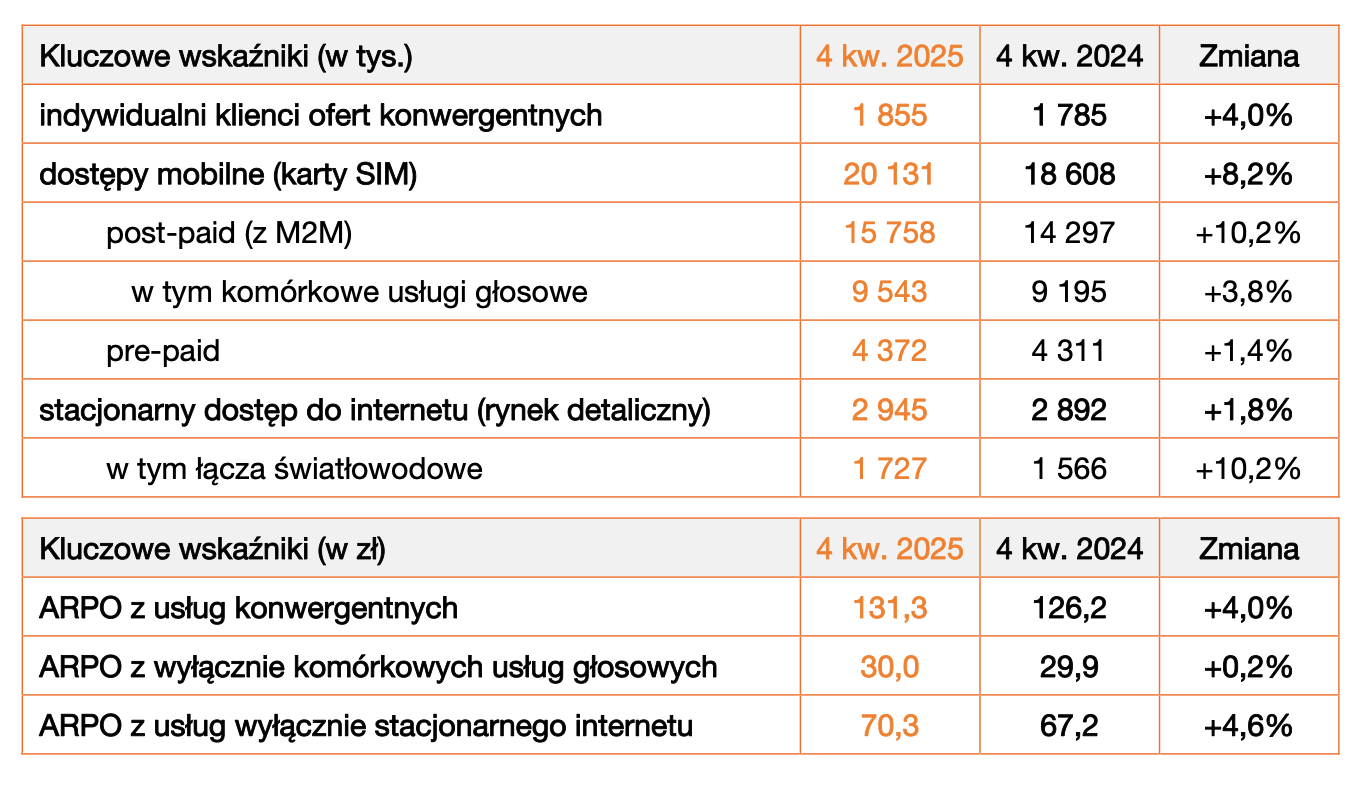 Baza klientów usług przedpłaconych w 2025 roku wzrosła o 61 tys. i w ujęciu rocznym zwiększyła się o 1,4%, w wyniku skutecznych działań marketingowych. Wskaźnik ARPO z usług przedpłaconych wyniósł 15,8 zł w 4 kw. i w ujęciu rocznym wzrósł o 2,5%. Niższa dynamika, w porównaniu do poprzednich kwartałów wynikała z wyższej bazy porównawczej po wprowadzeniu podwyżek cen w 4 kw. 2024 r.
