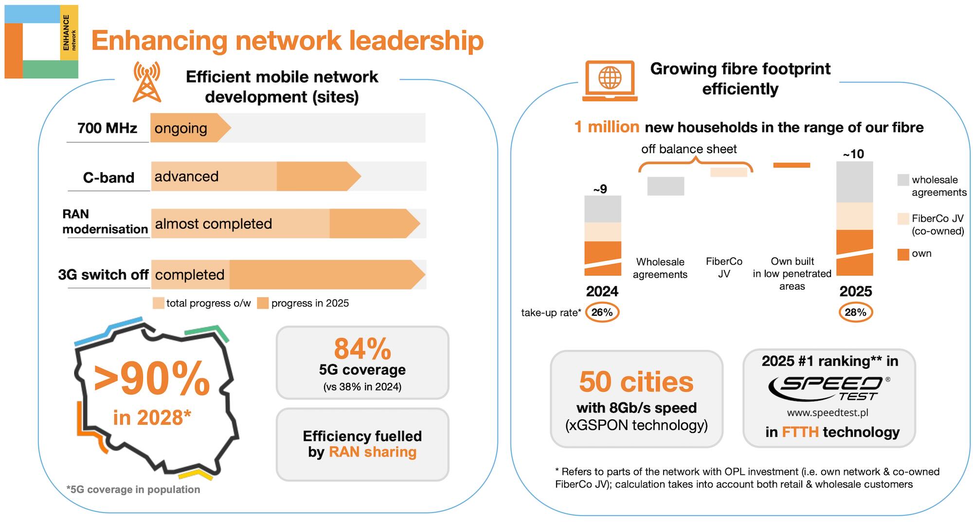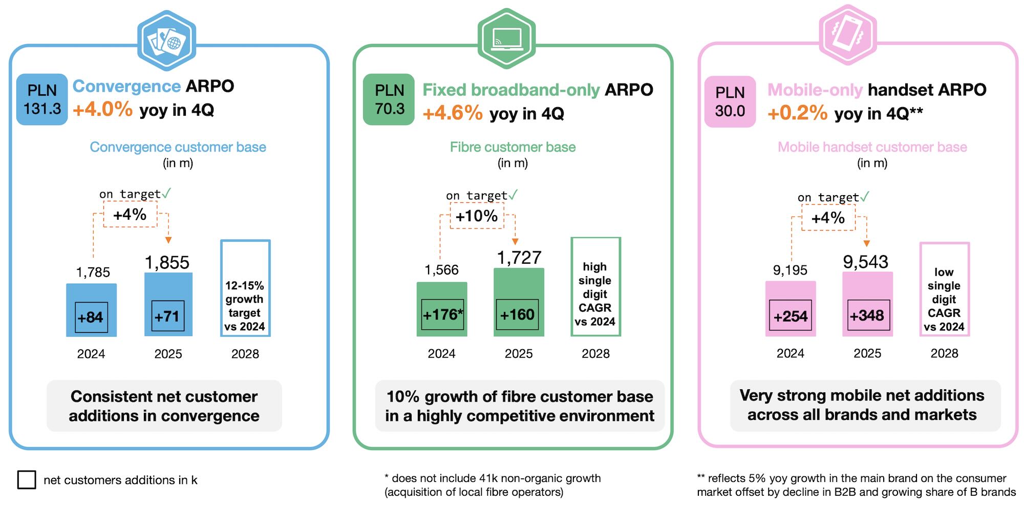 Liczba indywidualnych klientów ofert konwergentnych zwiększyła się w 2025 roku o 71 tys., czyli o 4% rok-do-roku, osiągając poziom 1,86 mln. Wskaźnik ARPO wyniósł 131,3 zł w 4 kw. i w ujęciu rocznym zwiększył się o solidne 4,0%, dzięki strategii nastawionej na wartość, wysokiemu popytowi na usługi telewizyjne oraz ofertom światłowodu o wyższych prędkościach. Dynamika wzrostu bazy klientów konwergentnych w 2025 roku była zgodna z celem w zakresie wzrostu do 2028 roku, określonym w strategii Lead the Future, i odzwierciedlała wysokie nasycenie bazy klientów dostępu szerokopasmowego usługami konwergentnymi, przekraczające 70%, a także silną konkurencję.
