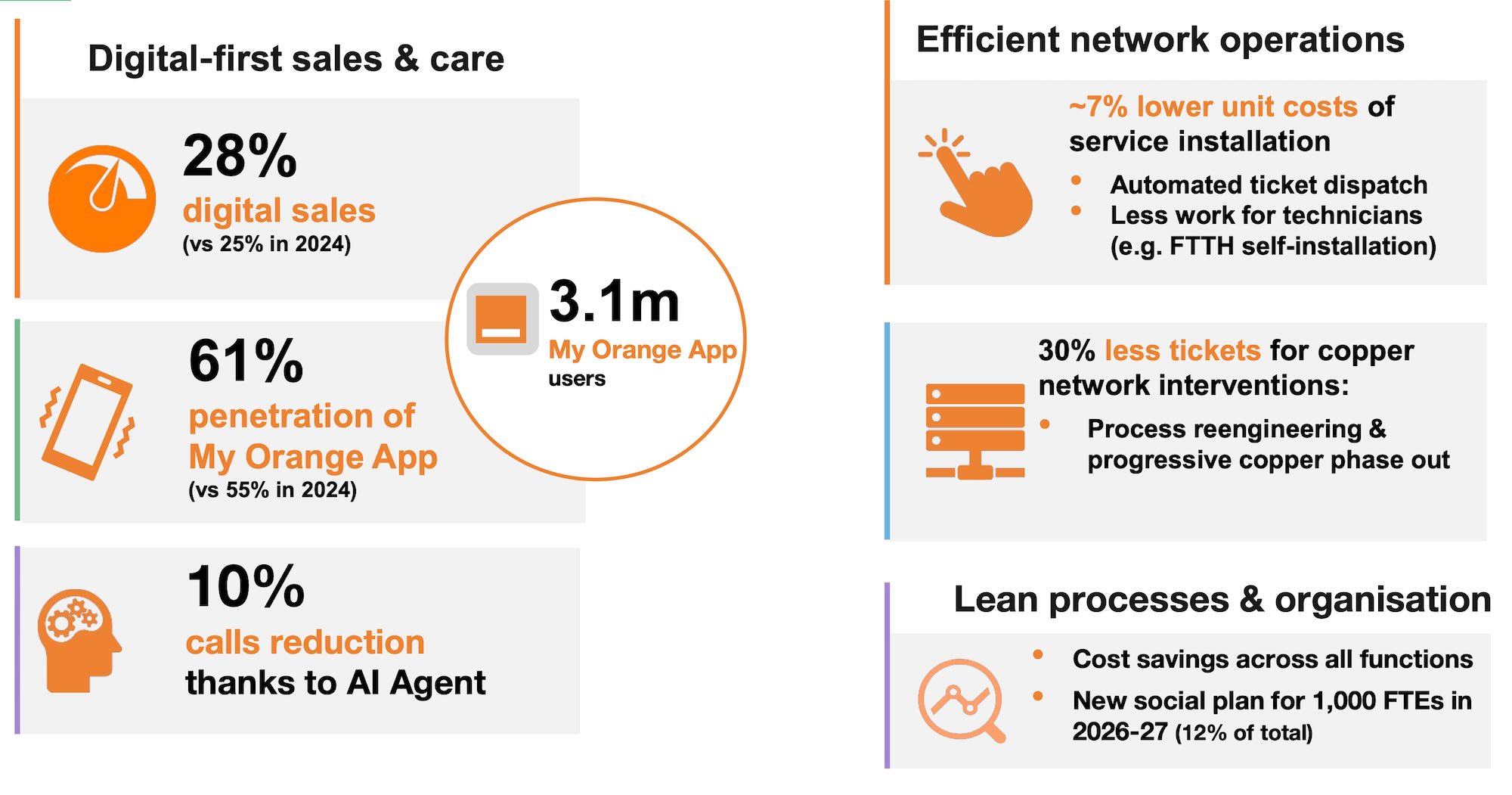 W samym czwartym kwartale przychody zwiększyły się w ujęciu rocznym o 155 mln zł, czyli o 4,6%. Główne czynniki wzrostu były podobne jak w przypadku wyników całorocznych. Przychody z kluczowych usług telekomunikacyjnych zwiększyły się o 5,5% rok-do-roku (co oznacza nieco niższą dynamikę wzrostu niż w kilku poprzednich kwartałach, odzwierciedlającą wyższą bazę porównawczą, wynikającą z wprowadzonych w listopadzie 2024 roku podwyżek cen usług przedpłaconych).