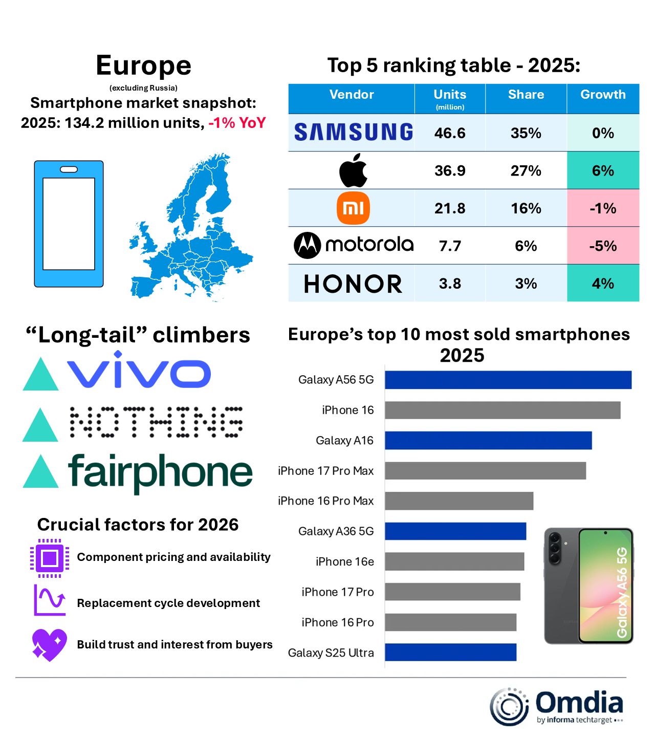 Z danych Omdia wynika, że w 2025 roku najczęściej kupowanym smartfonem w Europie był Samsung Galaxy A56 5G. To kolejny sygnał, że w regionie wciąż najmocniej sprzedają się telefony ze średniej półki, a nie najdroższe flagowce.