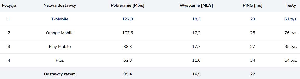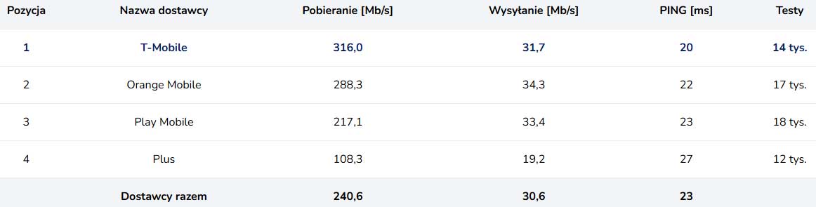 T-Mobile utrzymał prowadzenie w kategorii 5G, delikatnie poprawiając wynik z 315,9 Mb/s do 316,0 Mb/s. Orange, mimo spadku z 306,4 Mb/s do 288,3 Mb/s, zachowało drugą lokatę. Play pozostał na trzecim miejscu, notując nieznaczny wzrost prędkości z 217 Mb/s do 217,1 Mb/s.