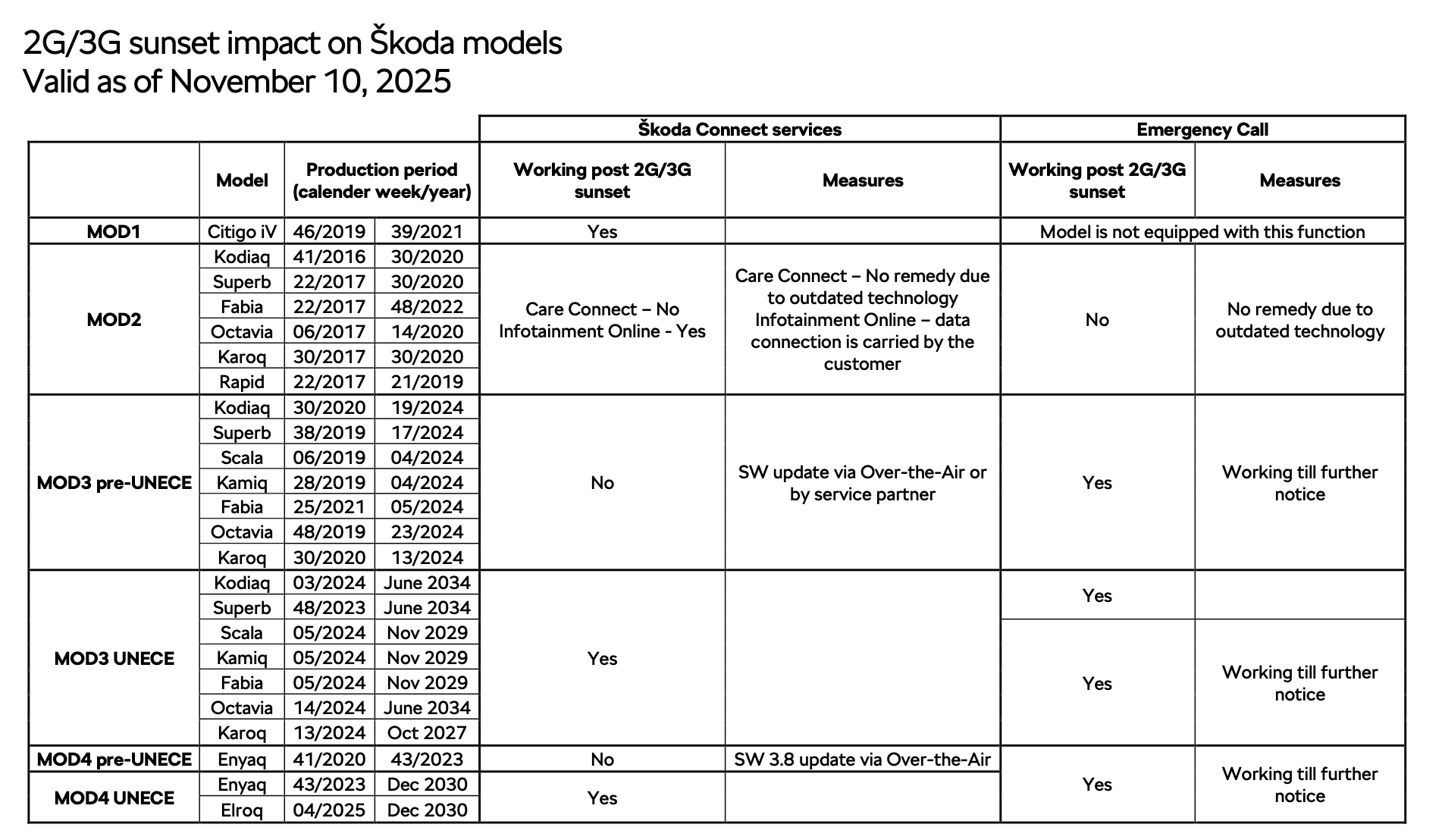 Z drugiej strony Škoda wprost wskazuje, że właściciele aut z grupy MOD2 po wygaszeniu 2G i 3G stracą dostęp do usług Škoda Connect, poza usługą Infotainment Online. W przypadku tych samochodów producent mówi też o wpływie na eCall i zaznacza, że z powodu ograniczeń technologicznych nie ma dostępnego rozwiązania przywracającego działanie tej funkcji.