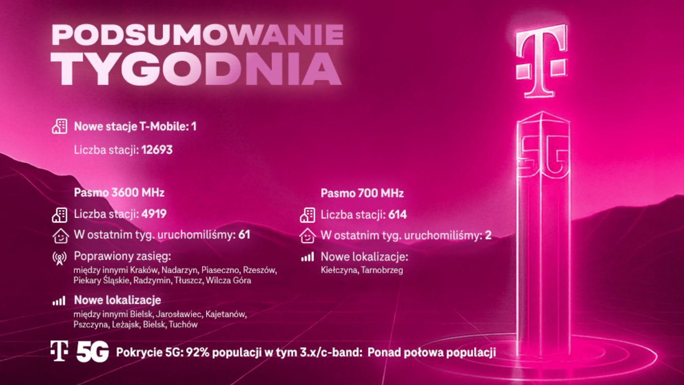 Operator poinformował, że zasięg 5G obejmuje już 92 proc. populacji Polski, a sieć działająca w paśmie 3,6 GHz, określanym też jako c-band, dociera już do ponad połowy mieszkańców kraju. Łącznie T-Mobile ma obecnie 12 693 stacje bazowe.