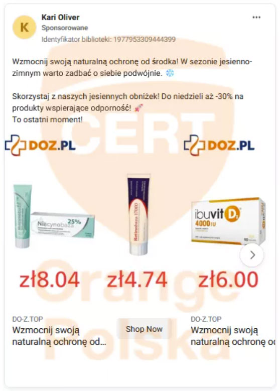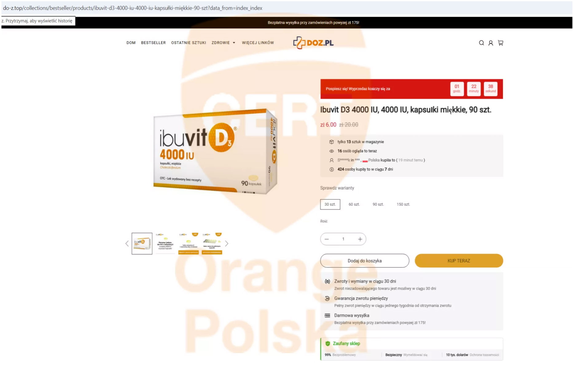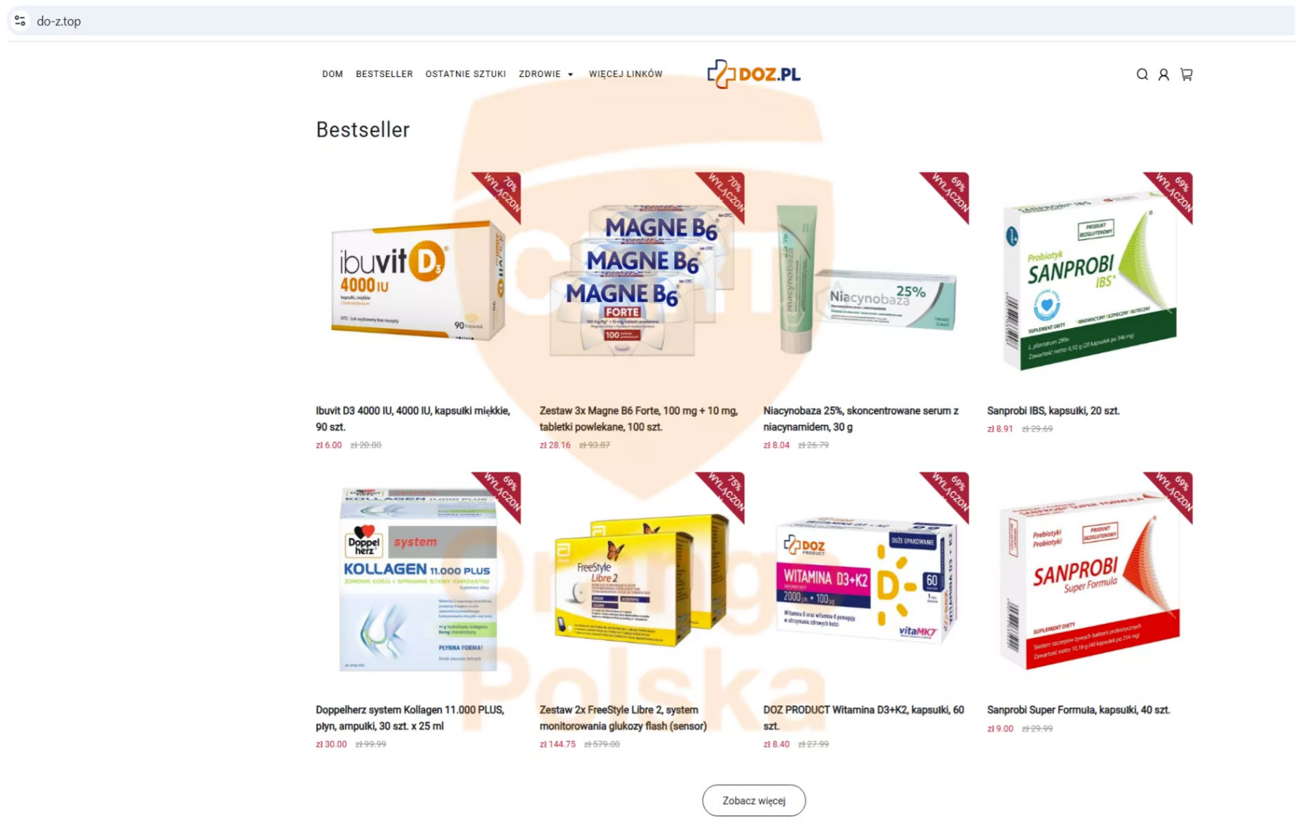 Schemat zaczyna się klasycznie od reklamy w mediach społecznościowych. Kliknięcie prowadzi na adres podobny do prawdziwego, np. do-z[.]top, podczas gdy oficjalna strona sieci aptek działa pod doz[.]pl. Różnica jest drobna, a na telefonie łatwo ją przeoczyć – zwłaszcza że oszuści kopiują typografię i układ strony tak, by na pierwszy rzut oka „wszystko się zgadzało”. Do tego dokładają przynętę, która działa niemal zawsze: ceny wyglądające jak z innej rzeczywistości.