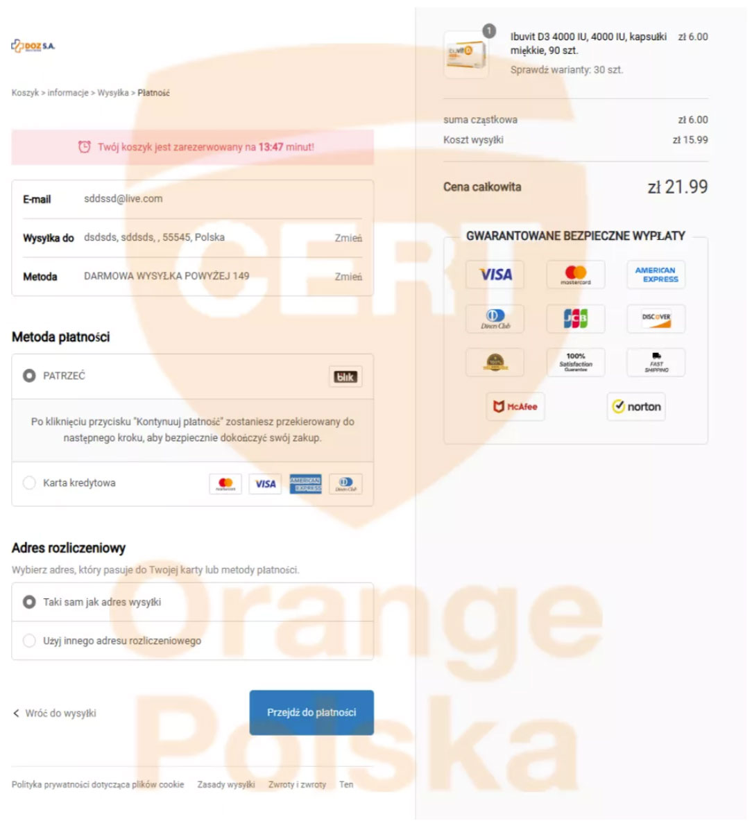 Oszuści potrafią „podwójnie” maskować całość: zaczynasz zakupy w czymś, co wygląda jak apteka DOZ, a kończysz w płatności prowadzącej do podmiotu, który z lekami nie ma nic wspólnego. Czasem wykorzystywana jest przy tym nazwa realnej firmy, użyta bez jej wiedzy, wyłącznie po to, by wyglądało to bardziej wiarygodnie albo by utrudnić szybkie namierzenie sprawców.