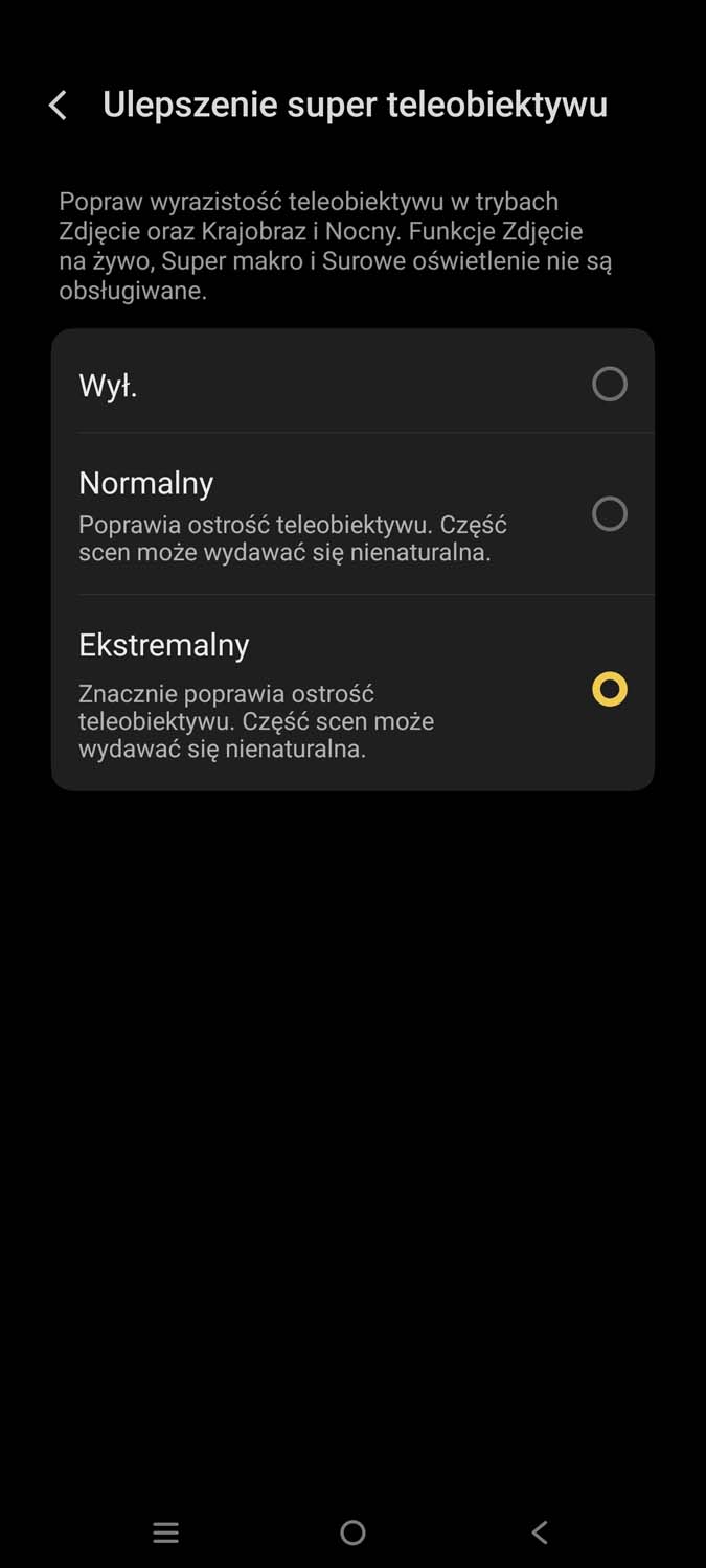 Zdjęcia na ekstremalnych zbliżeniach mogą w niektórych, szczególnych przypadkach wyglądać nienaturalnie. vivo jest tego świadome i w opcjach aparatu znajdziemy pozycję „Ulepszenie super teleobiektywu”, która daje użytkownikowi wybór: