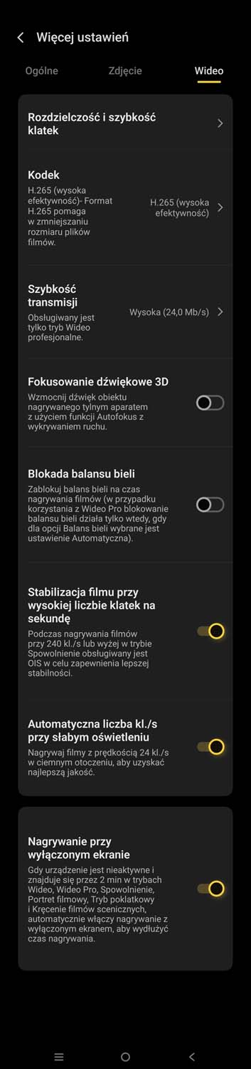 Warto też zajrzeć do ustawień wideo, gdzie znajdziemy opcję Wysokiej szybkości transmisji (bitrate) dla trybu Wideo Pro, co przekłada się na mniejszą kompresję i lepszą jakość obrazu w postprodukcji. Możliwe jest także wyłączenie redukcji szumów podczas nagrywania wideo, aby przeprowadzić ją później, mając nad procesem pełną kontrolę.