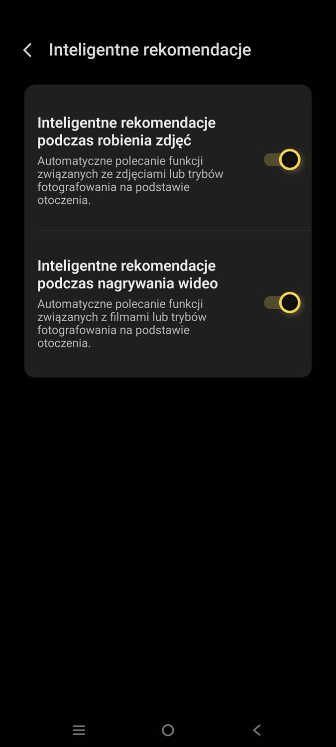 Telefon ma funkcję „Inteligentne rekomendacje”, która sugeruje przełączenie trybów na podstawie otoczenia. Choć brzmi to banalnie, system ten potrafi zasugerować np. tryb dokumentu czy makro w odpowiednim momencie, ale co ważne – można to całkowicie wyłączyć, jeśli wolimy pełną kontrolę manualną.