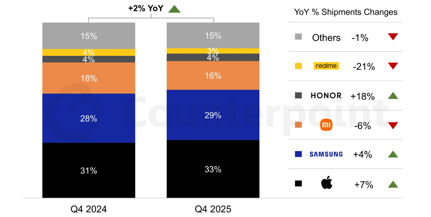 Liderem kwartału zostało Apple. Firma zwiększyła udział w rynku i zanotowała wzrost dostaw o 7 procent rok do roku, co Counterpoint wiąże z dobrą sprzedażą serii iPhone 17 oraz silnym wzrostem w Europie Wschodniej. W wykresie udziałów widać, że Apple zwiększyło udział z 31 do 33 procent między IV kwartałem 2024 i IV kwartałem 2025.